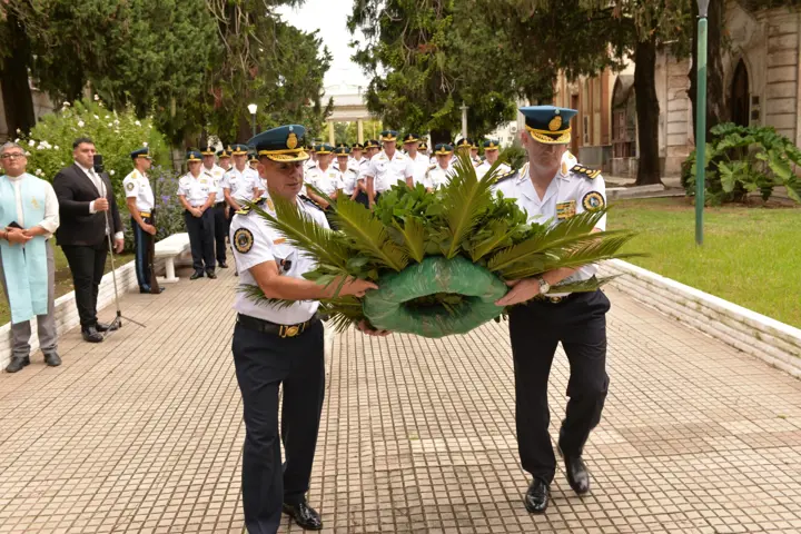 Posteriormente, en el Cementerio Municipal de la ciudad, se realizó una emotiva ceremonia en memoria de los policías fallecidos, donde se depositó una corona de laureles en homenaje a aquellos hombres y mujeres que, con vocación de servicio, dedicaron su vida a la institución y al cuidado de la comunidad.
